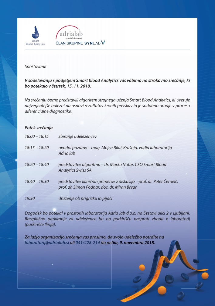 Smart Blood Analytics bo rezultate svojega dela strokovni javnosti predstavilo v četrtek, 15. 11. 2018, ob 18.00 uri, na sedežu kliničnega laboratorija AdriaLab, ki v okviru  skupine Synlab v Ljubljani svojim strankam zagotavlja meritve krvnih parametrov na najvišjem nivoju. Dogodek je namenjen samo strokovni javnosti. Prijave so obvezne na laboratorij@adrialab.si ali 041 / 428 – 214.