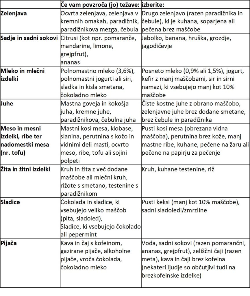 Simptomi kot so zgaga, pekoči občutki v prsih ali grenek okus v ustih, se pojavljajo pogosto kot posledica vračanja želodčne kisline v požiralnik in usta. Požiralnik je cev, ki povezuje usta in želodec. Na koncu požiralnika, kjer se spaja z želodcem, se nahaja zaklopka, ki običajno preprečuje, da bi se želodčna tekočina vračala. Za to, da je zaklopka zaprta, poskrbi krožna mišica. Nekatera vrsta hrane povzroči, da se mišica na koncu požiralnika preveč sprosti. Kakšna druga vrsta hrane pa lahko povzroči, da se v želodcu ustvarja več kisline.