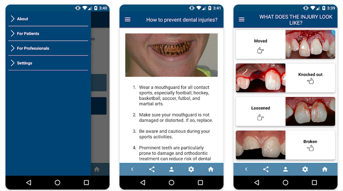 Aplikacija vodi pacienta oziroma starše, učitelje ali trenerje, ki so ob otroku, pri tem, kako naj čim hitreje in pravilno odreagirajo ob poškodbi. Pod zavihkom »I HAVE A TOOTH INJURY« se odprejo slikovni primeri poškodovanih zob in okolnih tkiv z enostavnimi poimenovanji. Zob je lahko izbit, premaknjen, vtisnjen v dlesen, majav, zlomljen ali pa so poškodovana tudi okolna tkiva, koža, ustnice ali dlesni ali celo čeljustna kost in čeljustni sklep. Na podlagi slike in poimenovanja poškodbe po kliku nanjo sledijo enostaven opis priporočenih postopkov za ravnanje na kraju nezgode in priporočila za nadaljnje ukrepanje. Zapisano je tudi, kako urgentno je ukrepanje in kako hitro naj pacient obišče zobozdravnika za nadaljnje zdravljenje za vsak posamezen primer.
