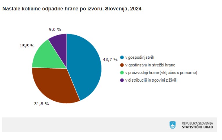 - Največ odpadne hrane nastane v gospodinjstvih (60 %), sledijo gostinstvo (28 %) in trgovina (12 %).