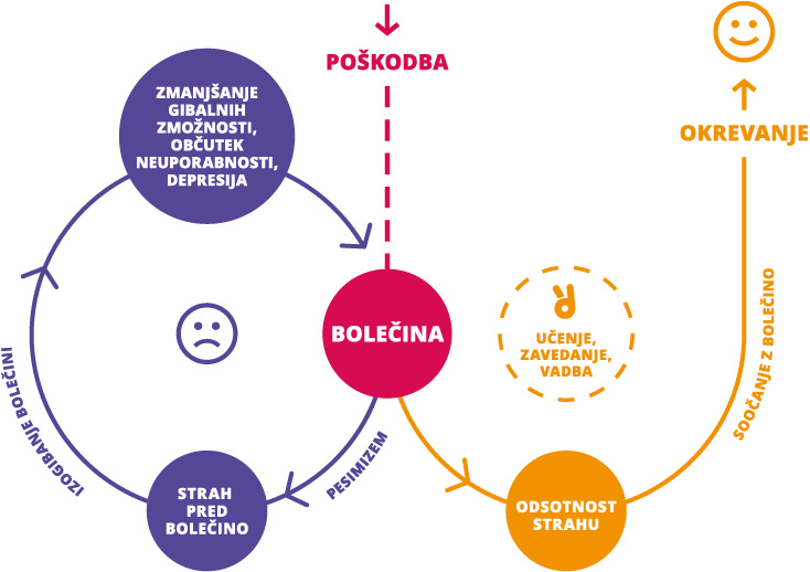 Strah pred bolečino ali ponovno poškodbo je pogosto razlog, da se ne upamo gibati. Občutek imamo, da bomo z gibanjem še poslabšali svoje stanje. Tako ostajamo v začaranem krogu bolečine, kjer še dodatno zmanjšujemo svoje gibalne sposobnosti, ki so za okrevanje najpomembnejše (vijolična barva). Znanstveno je dokazano, da pot k okrevanju vodi preko učenja ter izvajanja pravilnih vaj in le tega boste deležni pod strokovnim vodstvom Re:aktiva.