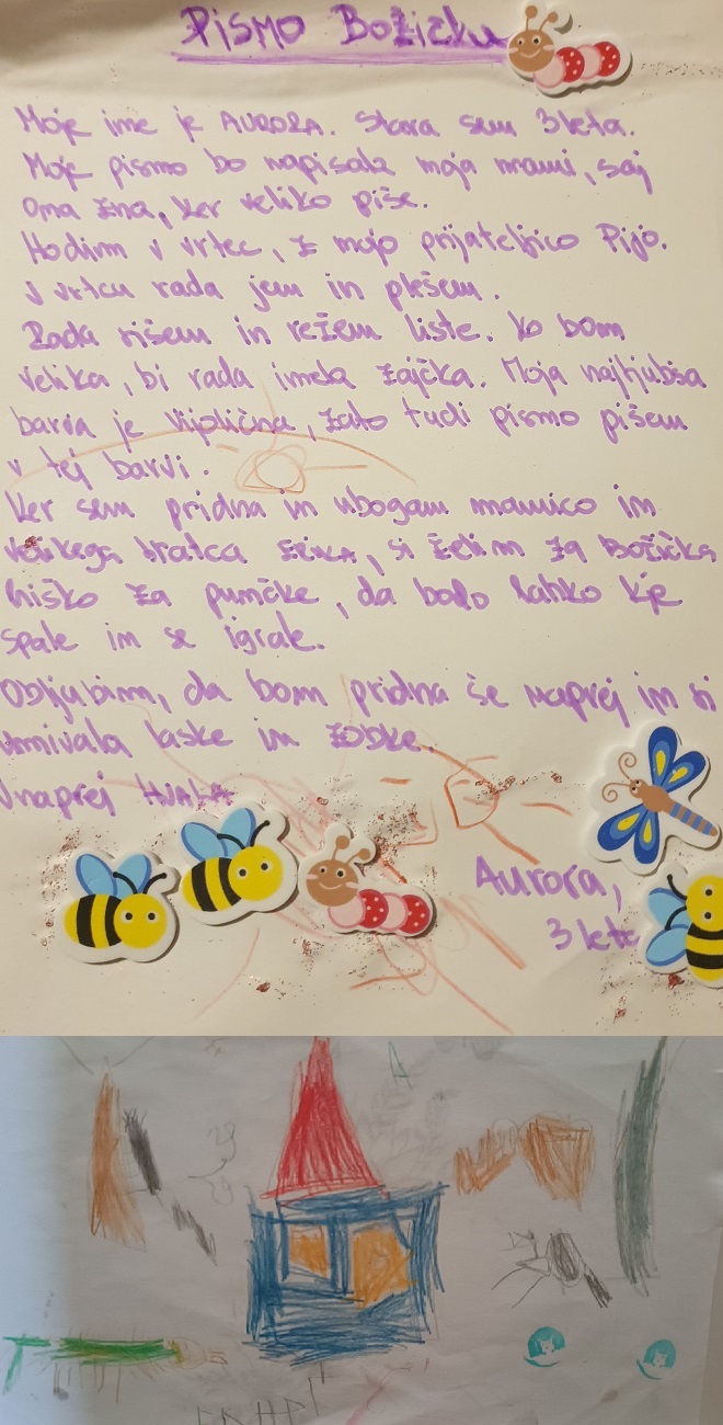 Moje ime je Aurora. Stara sem 3 leta. Moje pismo bo napisala moja mami, saj ona zna, ker veliko piše. Hodim v vrtec, v vrtcu rada jem in lepšem. Rada rišem in režem liste. Ko bom velika, bi rada imela zajčka. Moja najljubša barva je vijolična, zato tudi pismo pišem v tej barvi. Ker sem pridna in ubogam mamico in velikega bratca Erika, si želim za Božička hiško za punčke, da bodo lahko kje spale in se igrale. Obljubim, da bom pridna še naprej in si umivala laske in zobke.