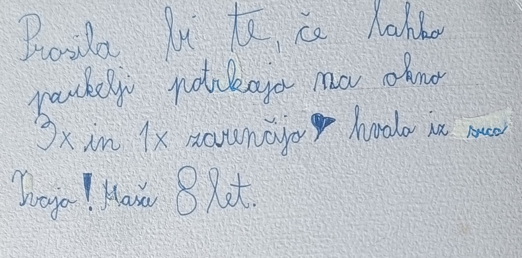 Prosila bi te, če lahko parklji potrkajo na okno 3x in 1x zarenčijo. Hvala iz srca. Tvoja Maša