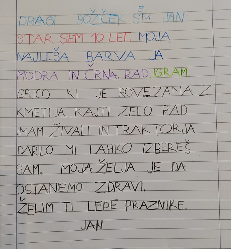 Dragi Božiček, sem Jan. Star sem 10 let. Moja najlepša barva je modra in črna. Rad igram igrico, ki je povezana s kmetijo. Kajti zelo rad imam živali in traktorja. Darilo mi lahko izbereš sam. Moja želja je, da ostanemo zdravi. Želim ti lepe praznike.