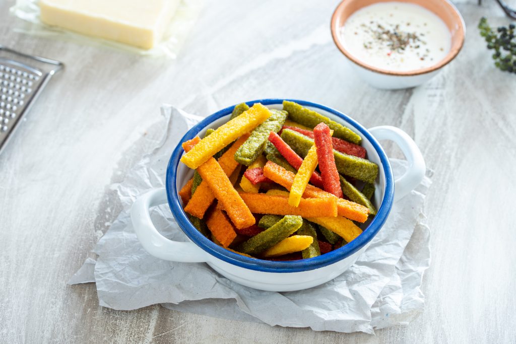 • Pladenj postavimo v pečico, segreto na 220 °C. Polentin pomfri pečemo 20 minut.